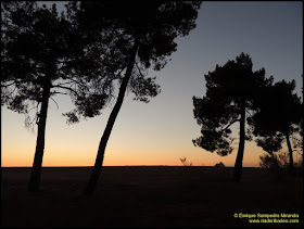 Ya de noche los chotacabras no fallaron. Uno de ellos se quedó a escasos metros de mí sobrevolando unos instantes, aunque no lo suficiente como para poder fotografiarlo. La única prueba gráfica de mi encuentro con ellos este año es esta pésima fotografía, de uno posado en una rama de un pino. Aunque hay que echarle mucha imaginación para verlo, lo reconozco. Ahí os dejo el reto, je, je, je.